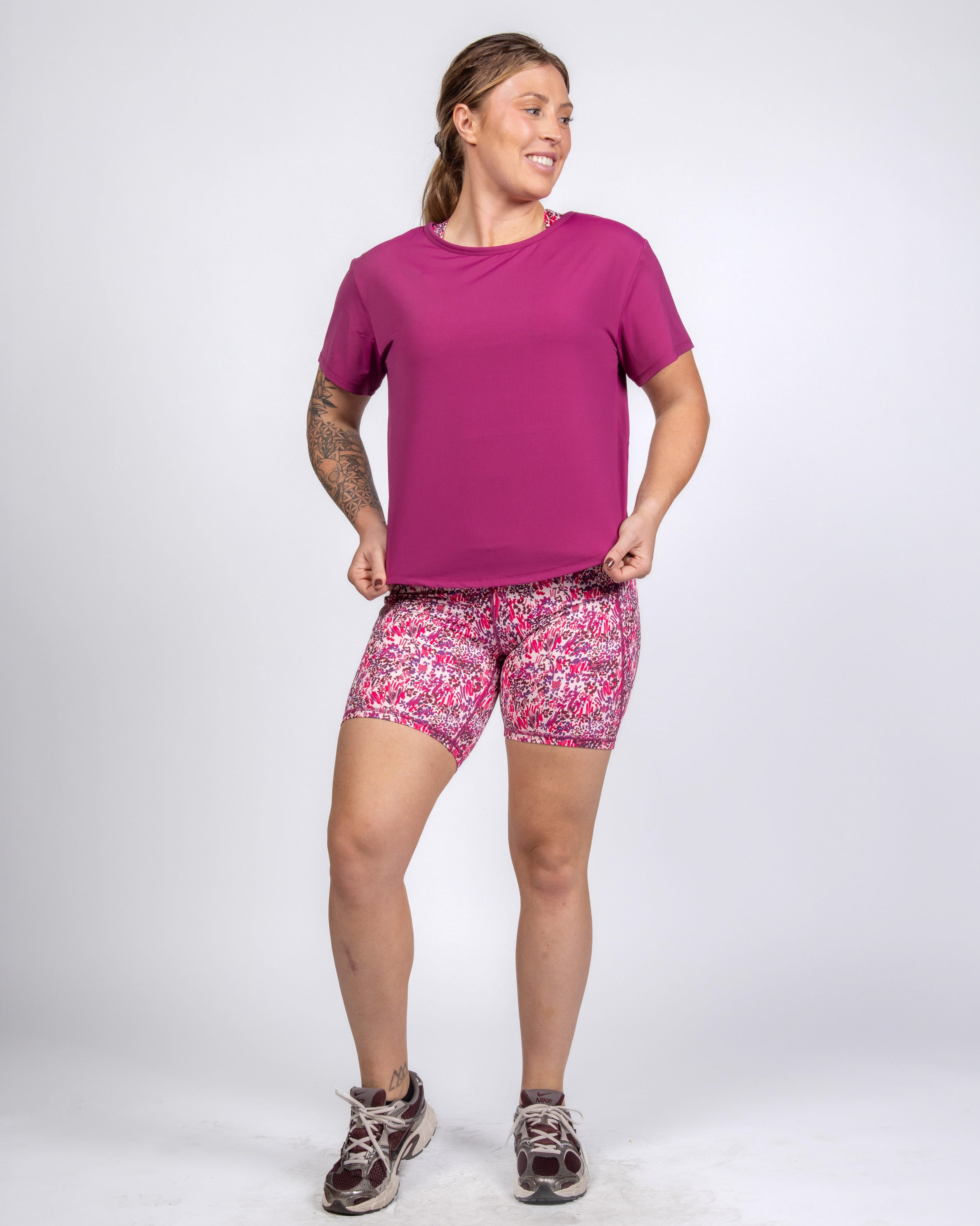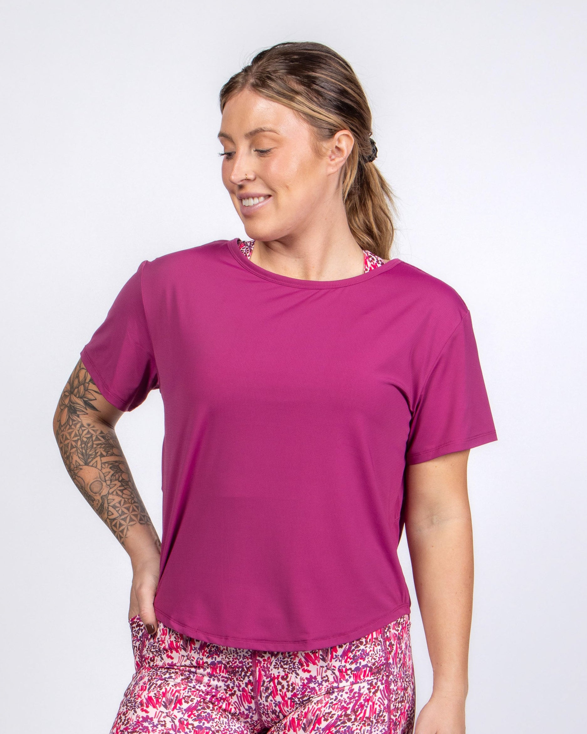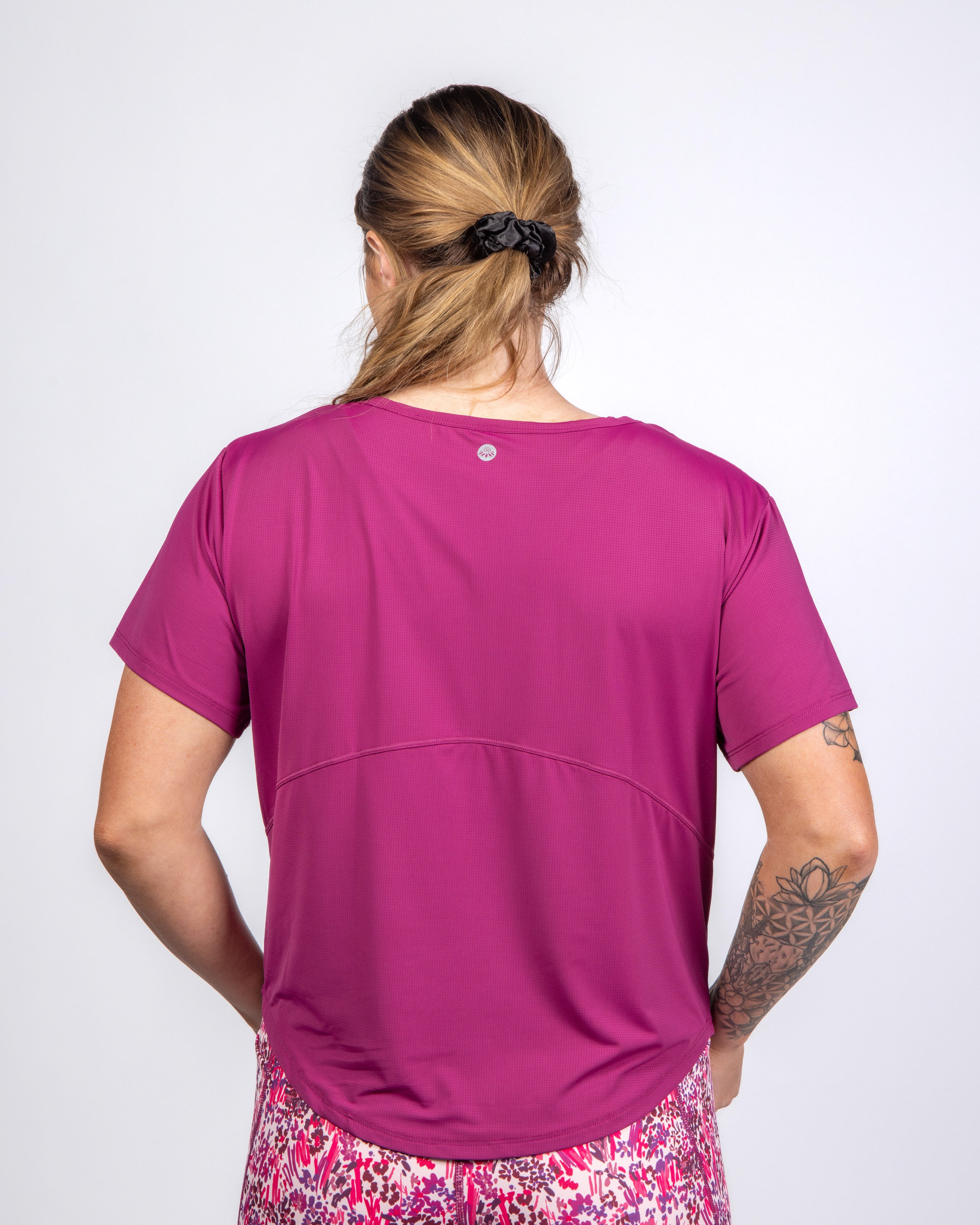 Light, breathable, and built for movement. The Race Ready Tee features perforated fabric for maximum airflow, keeping you cool and comfortable through every mile or rep. Designed with a curved front accent seam for a flattering fit and subtle style—this tee is performance-ready and made to move with you.