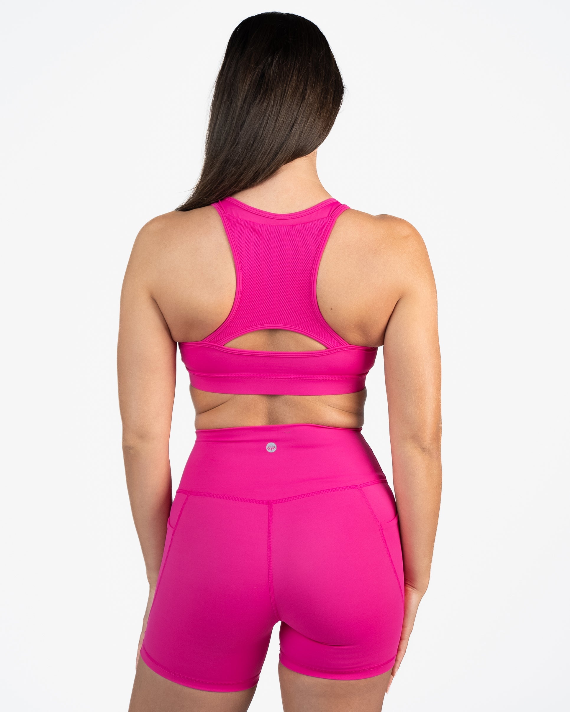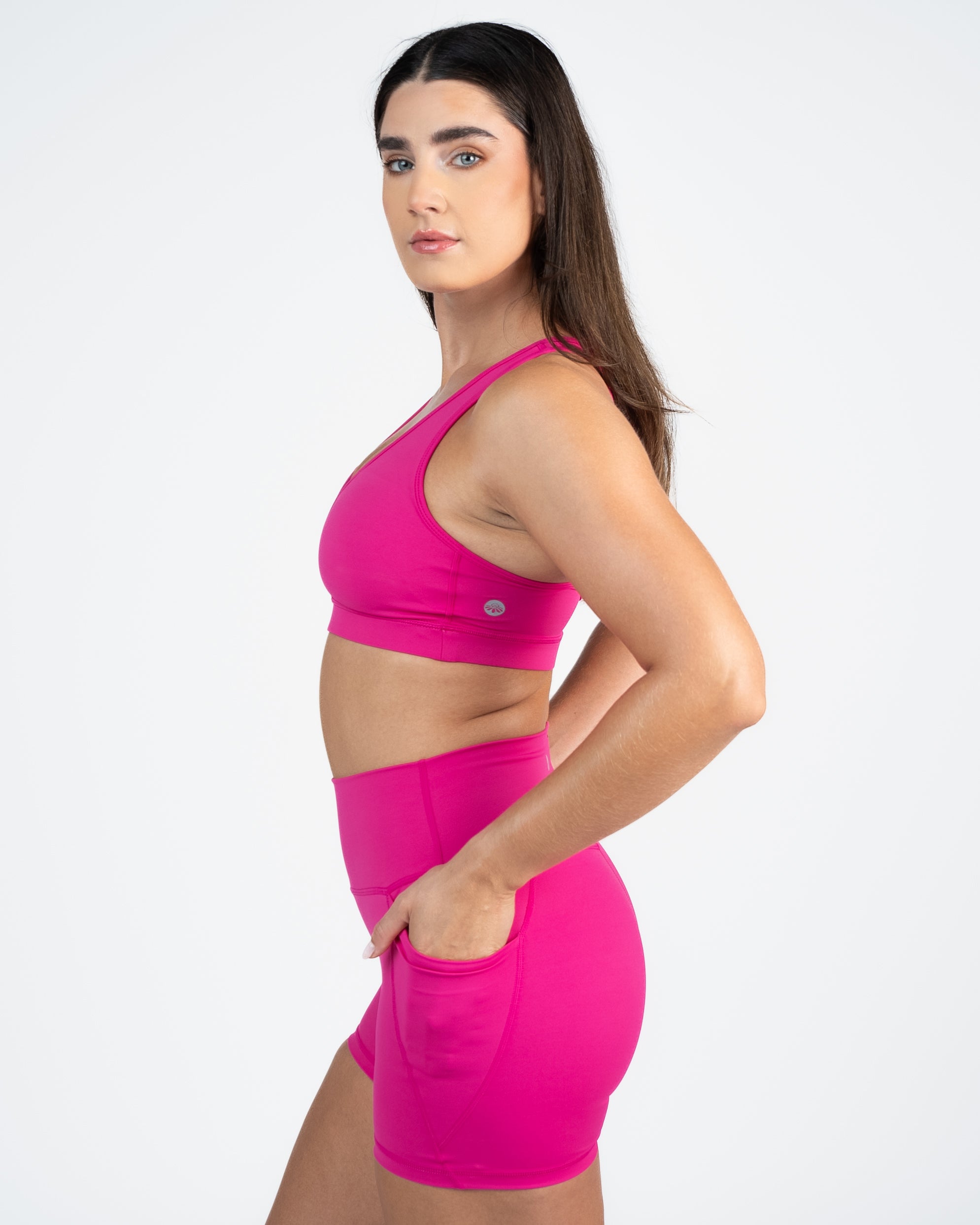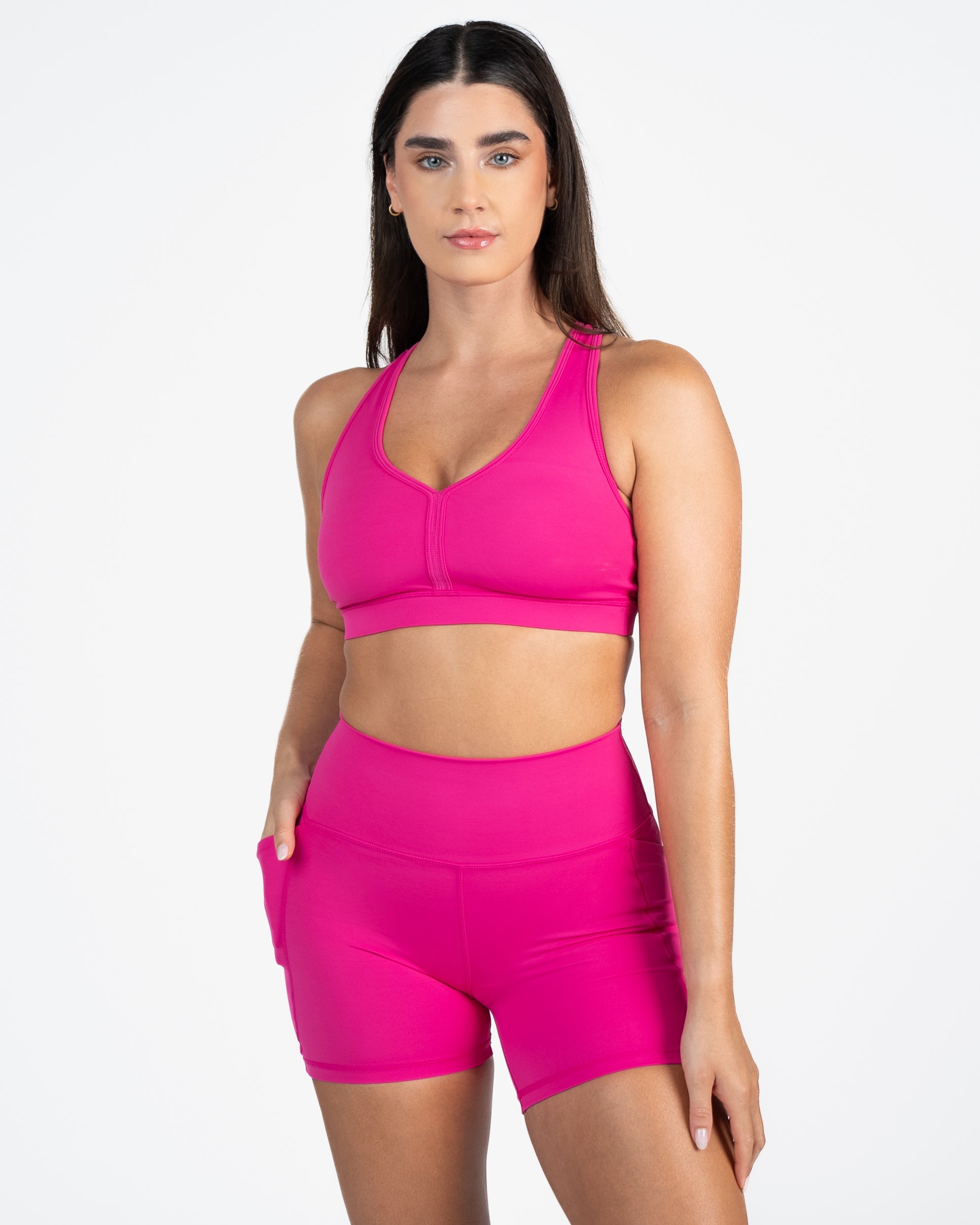 Designed with a sleek racerback and wire-free support, this bra is ideal for medium-impact activities. The V-neck creates a flattering silhouette, while flat, chafe-resistant seams ensure irritation-free movement during any workout. One of its standout features is the back pocket, allowing you to stow essentials like your phone, keys, or other necessities, keeping them secure and out of your way. Plus, it includes removable cups for customizable support.