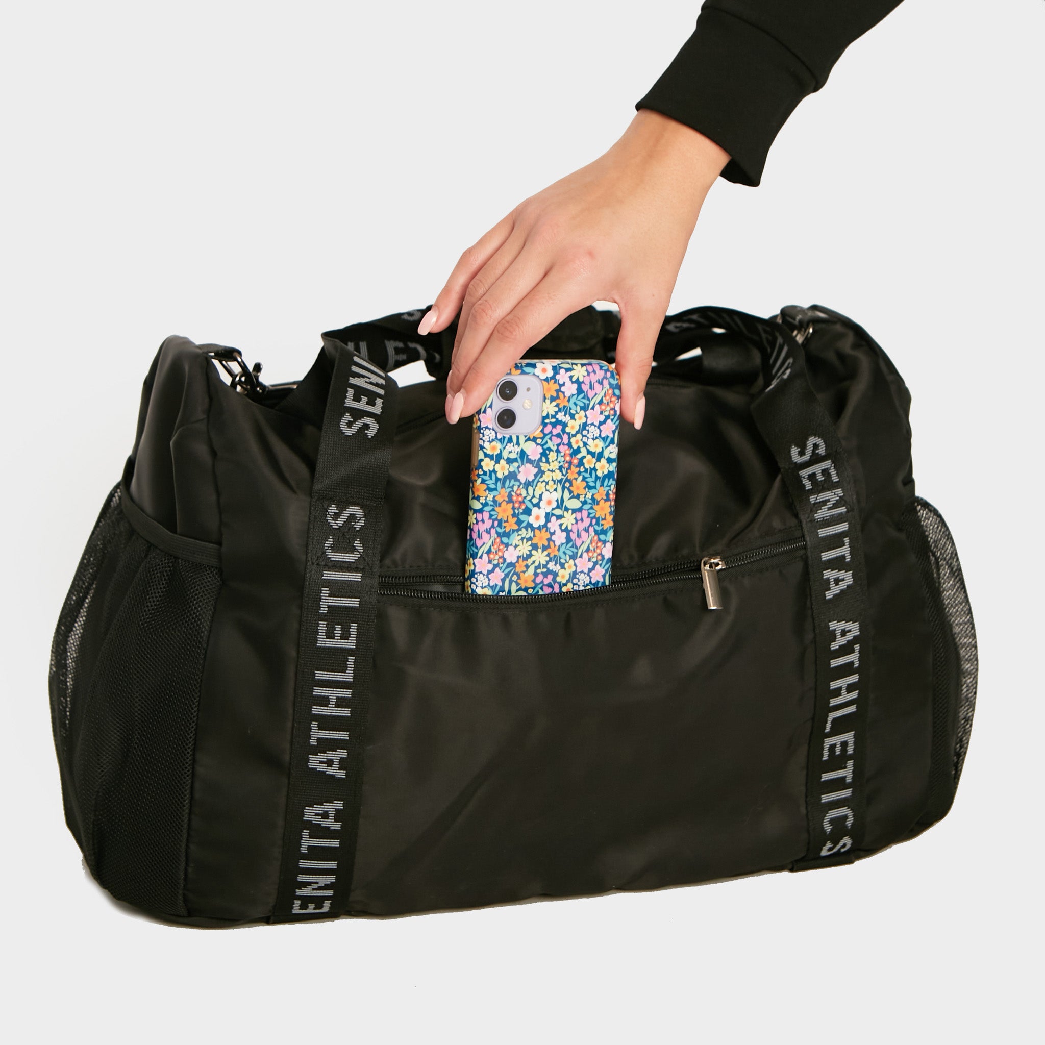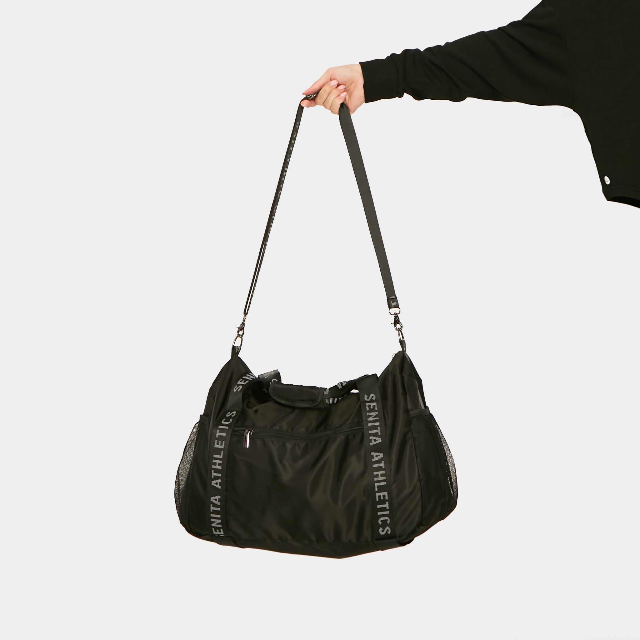 Need a gym bag to throw all your necessities into fast? We got you! The length is about 17" , with a 10 1/2" depth and about 9" wide. You can carry it with the long shoulder strap or use the two handles that can velcro together. Other features include two side zipper pockets, two open mesh pockets, a separate shoe bag holder. There are also two open mesh pockets and another zipper pocket on the inside.