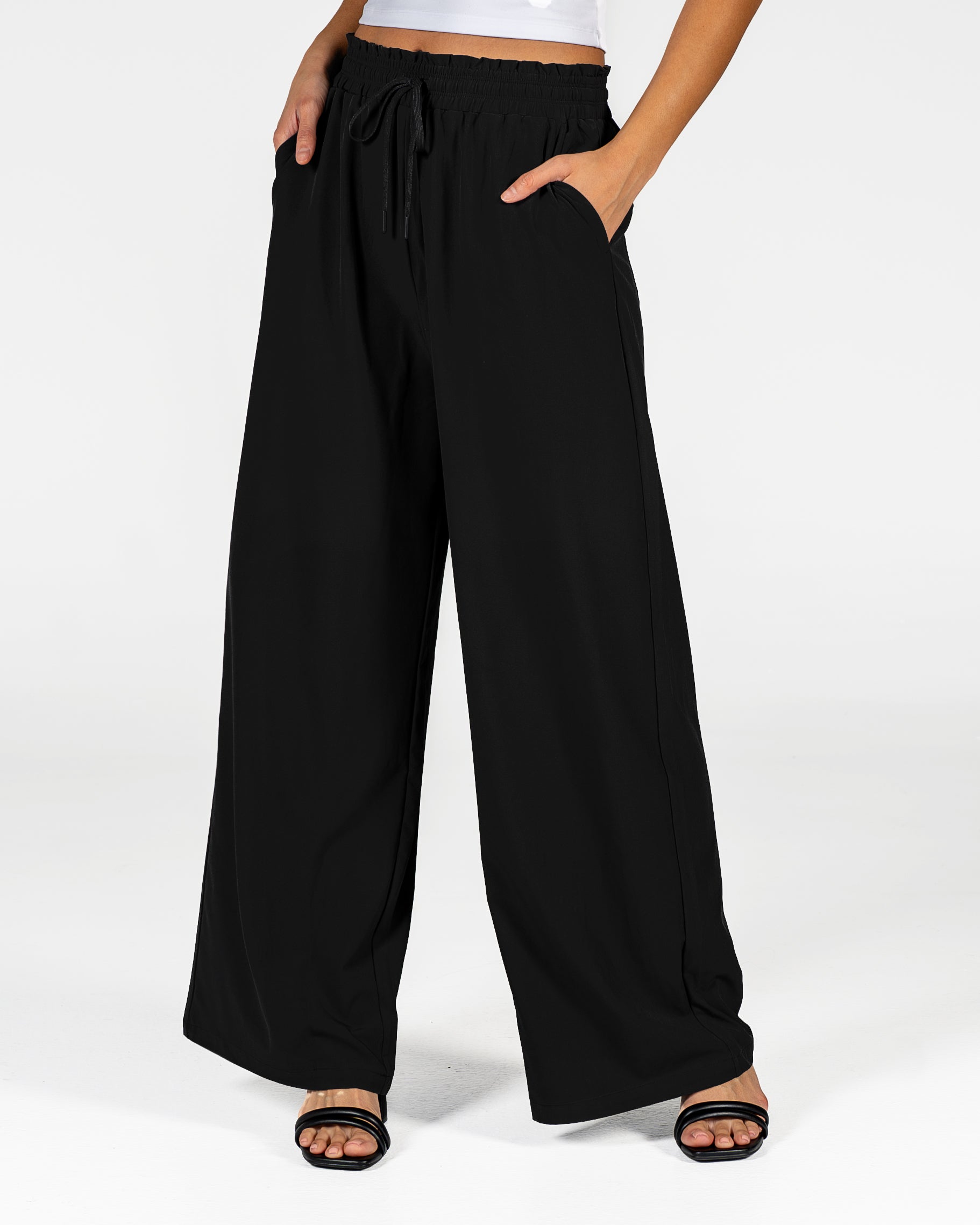 Discover the Destination Drawstring Pants: crafted for versatility and designed with your comfort in mind. These wide-leg pants are made from a soft, flowy woven fabric that ensures ease of movement and drapes beautifully on the body. The adjustable drawstring waist allows for a custom fit, whether you prefer a high or low waistline. Available in two inseam lengths, 27.5" and 30", they're designed to flatter diverse body types. A notable feature is the addition of a fifth hidden zipper pocket on the right side, enhancing the practical design with two front slimming pockets and two back pockets for a sleek, functional finish. These pants are your go-to for seamless transition from day to night, embodying the blend of style and utility.