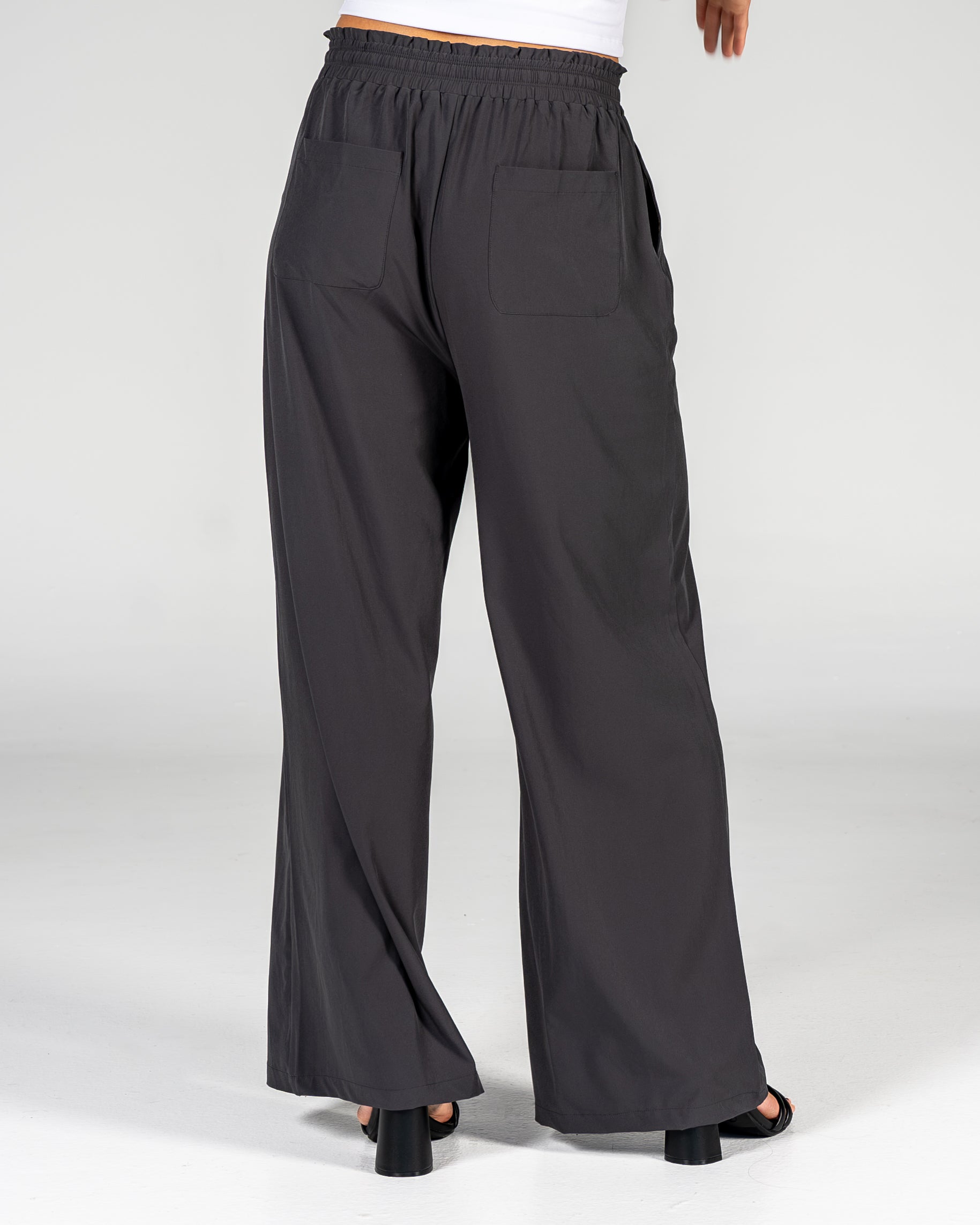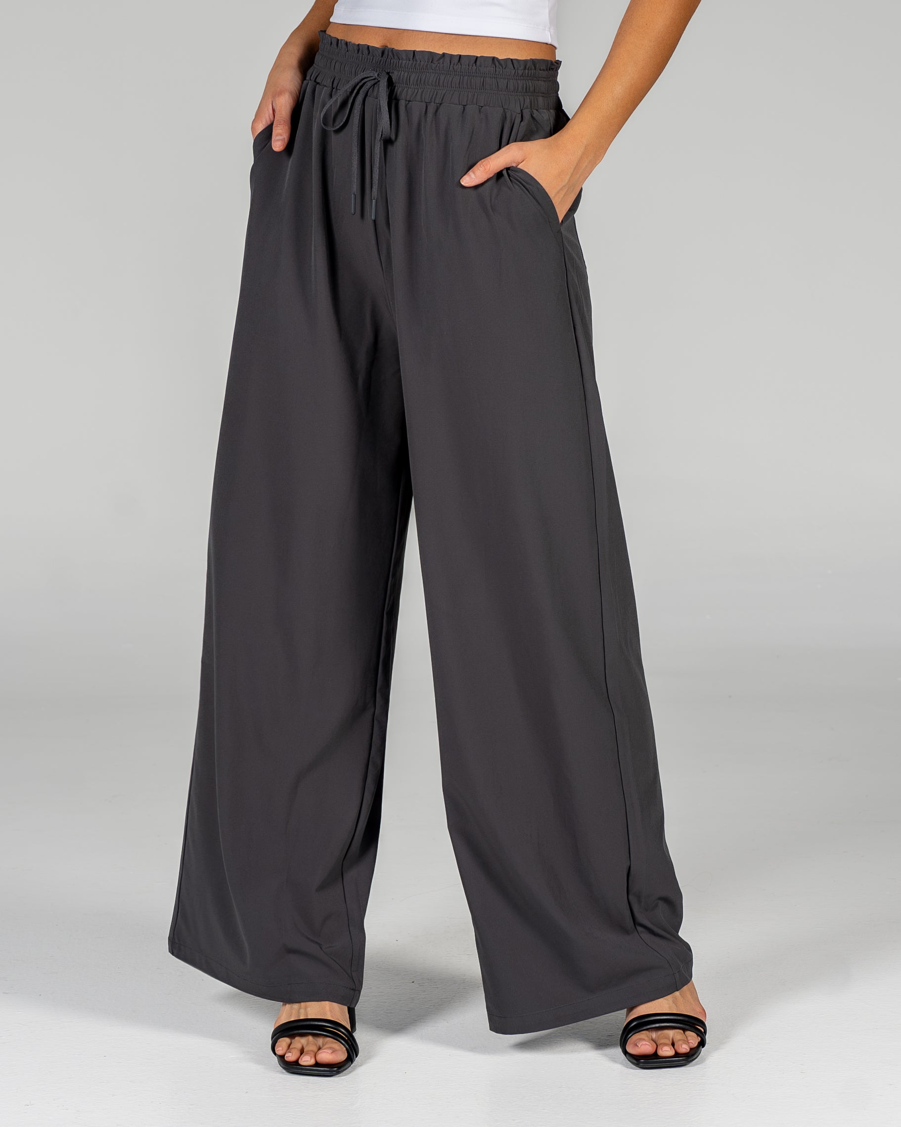 Discover the Destination Drawstring Pants: crafted for versatility and designed with your comfort in mind. These wide-leg pants are made from a soft, flowy woven fabric that ensures ease of movement and drapes beautifully on the body. The adjustable drawstring waist allows for a custom fit, whether you prefer a high or low waistline. Available in two inseam lengths, 27.5" and 30", they're designed to flatter diverse body types. A notable feature is the addition of a fifth hidden zipper pocket on the right side, enhancing the practical design with two front slimming pockets and two back pockets for a sleek, functional finish. These pants are your go-to for seamless transition from day to night, embodying the blend of style and utility.