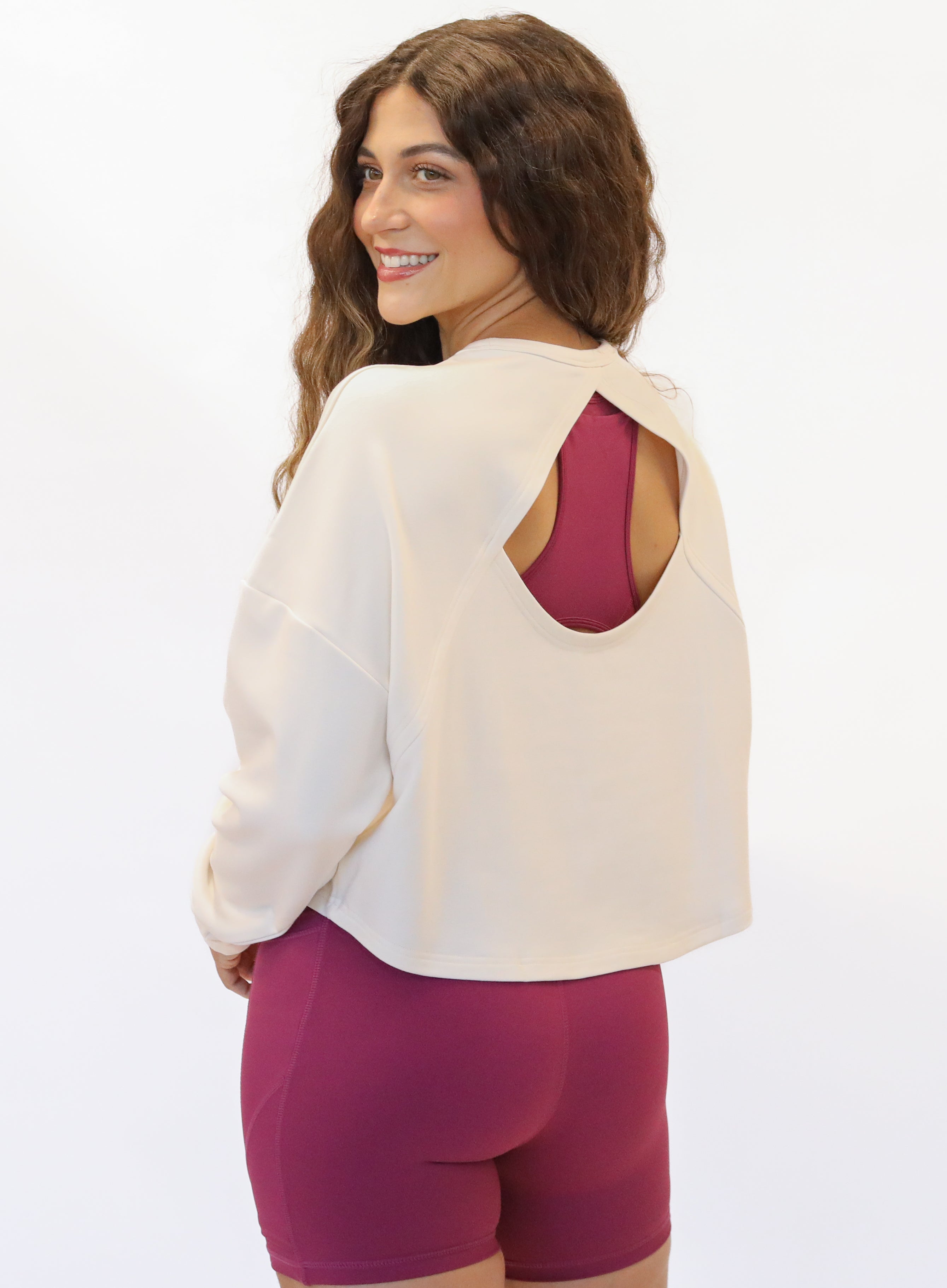 Keep it classy with this oversized fit long sleeve top that is both warm and stylish. With a buttery soft, light weight fleece fabric and a longer cropped length, this will give you all the comfort you desire. Pair it with a strappy tank or bra to show off through the hole cut out in the back that will surely make some heads turn!
