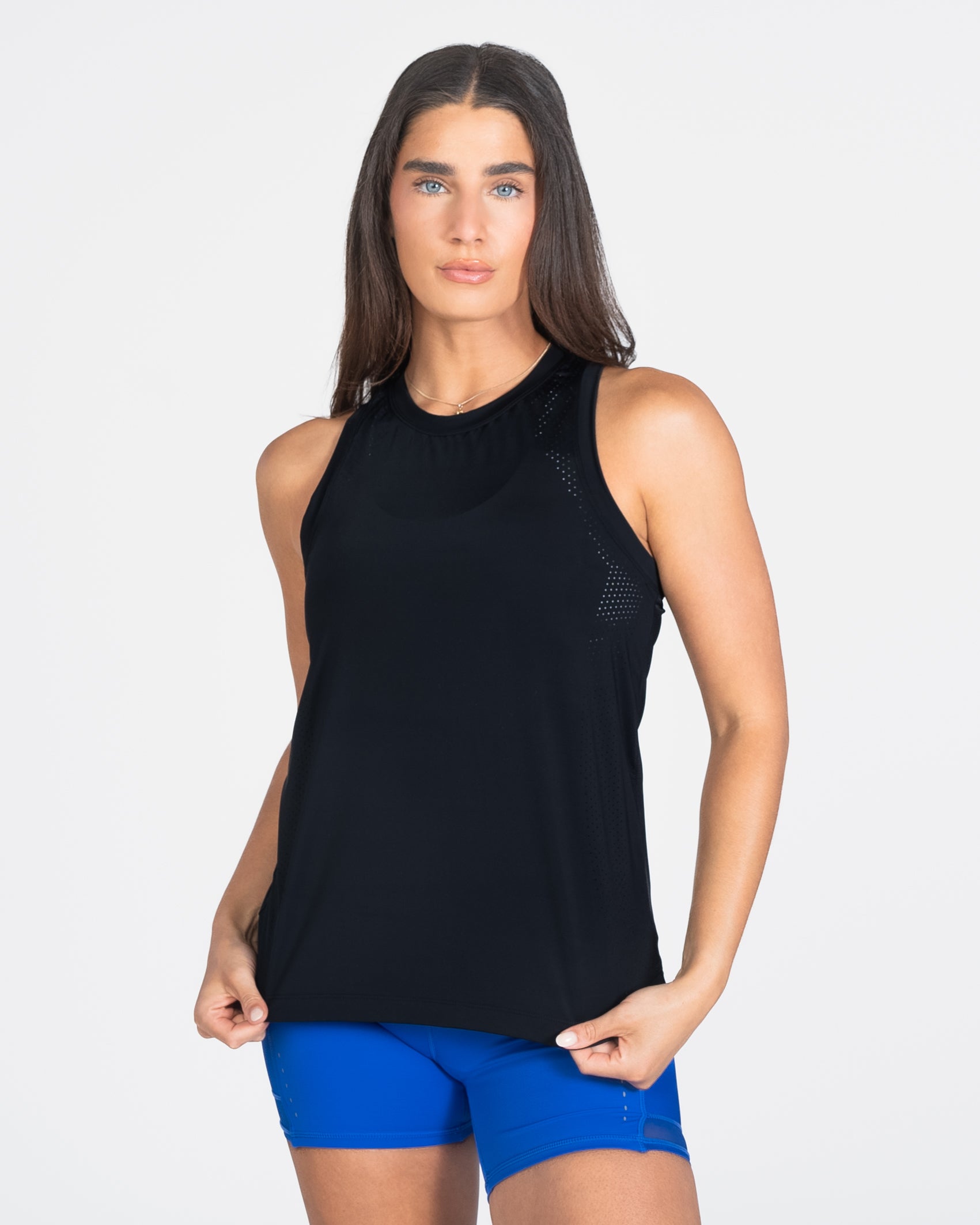 Designed in the same breathable fabric as our best-selling Laser Cut Pullover, this full-length tank is tailored to flatter with a body-slimming fit. It features intricate laser cut details throughout, enhancing ventilation to keep you cool and comfortable during intense workouts. Ideal for those who prefer extra coverage, this tank ensures you feel secure and stylish whether you're powering through a cardio session or mastering yoga poses. It's the perfect choice for active women seeking a blend of performance and sleek design in their workout wardrobe.