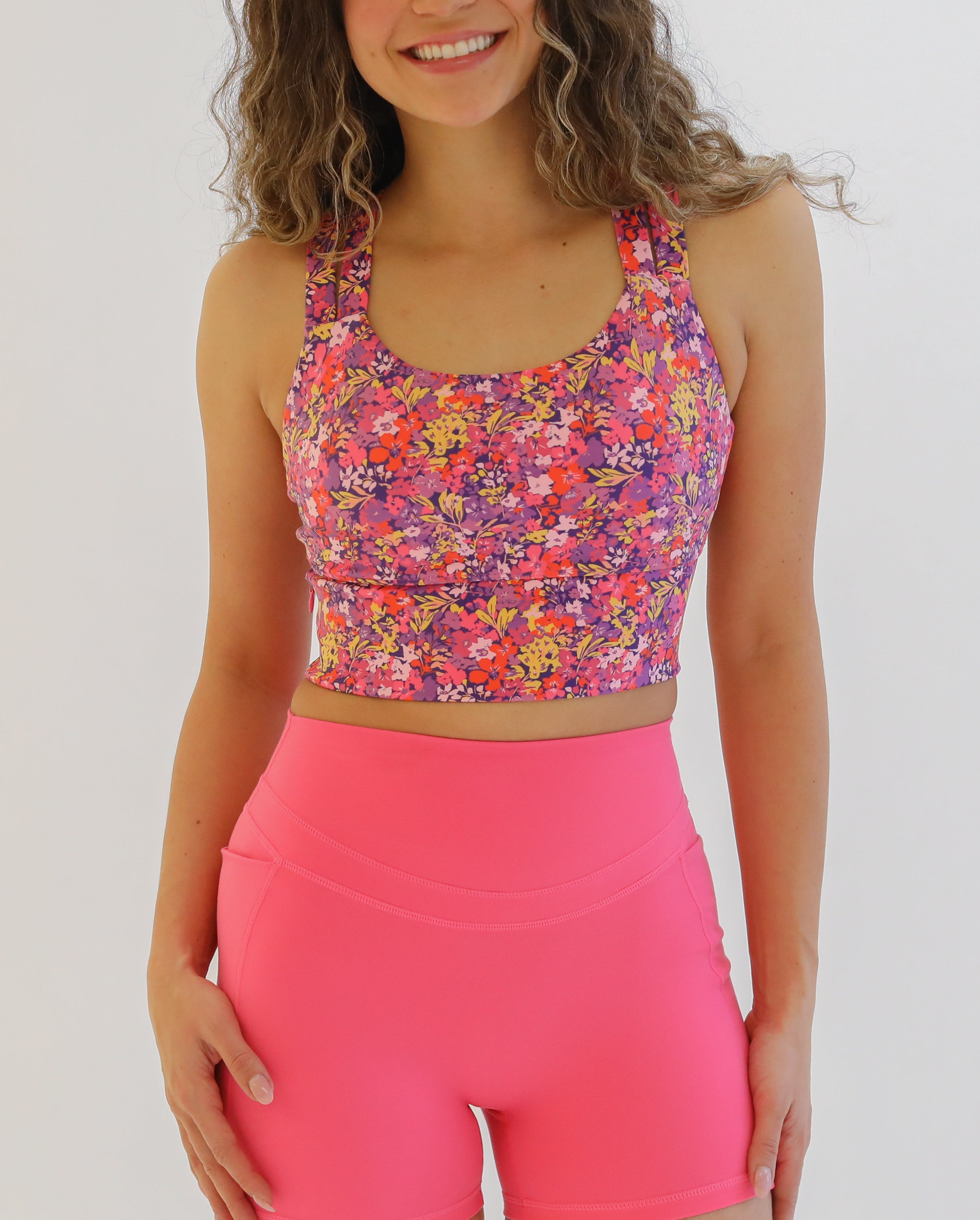 The Sierra Sports Bra was made to keep you cool and comfortable and to provide you with medium-to-high coverage. Made from a fast-drying and sleek lux fabric, this sports bra doesn't weigh you down when you're on the go. It features removable bra pad inserts, key pocket, and strappy back for extra support. We recommend this bra for medium impact activities such as dance, yoga, pilates or weight-lifting workouts.