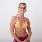 The Kate Bikini top is the must-have item for any beach babe. With removable cups, thin straps that can be tied at the back, and a v-neckline, this bikini top is one of our favorites for minimal tan lines.