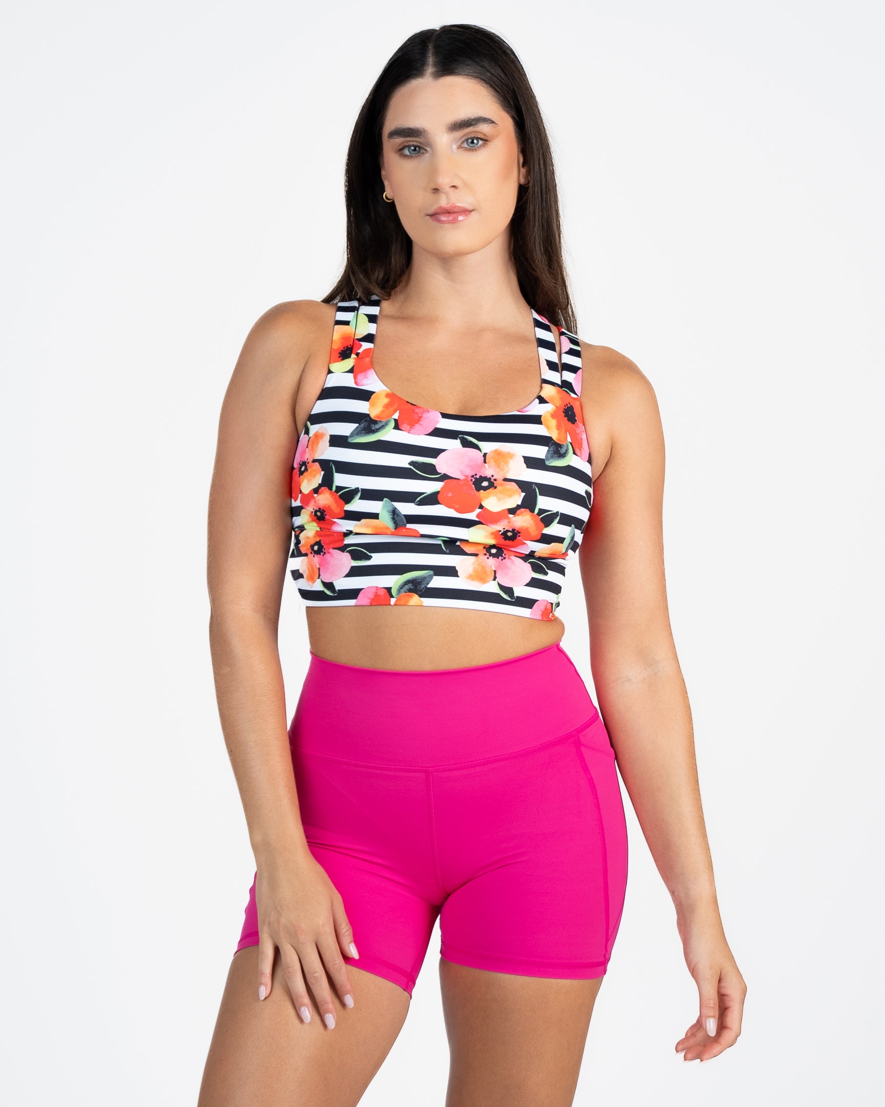 The Sierra Sports Bra was made to keep you cool and comfortable and to provide you with medium-to-high coverage. Made from a fast-drying and sleek lux fabric, this sports bra doesn't weigh you down when you're on the go. It features removable bra pad inserts, key pocket, and strappy back for extra support. We recommend this bra for medium impact activities such as dance, yoga, pilates or weight-lifting workouts.